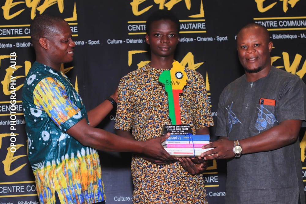 AWEKPON Rébecca et AKOUTEY Gildas, terminent lauréats de la deuxième édition du concours « J’épelle sans fautes » initié par l’Association des Jeunes Elites du Bénin.